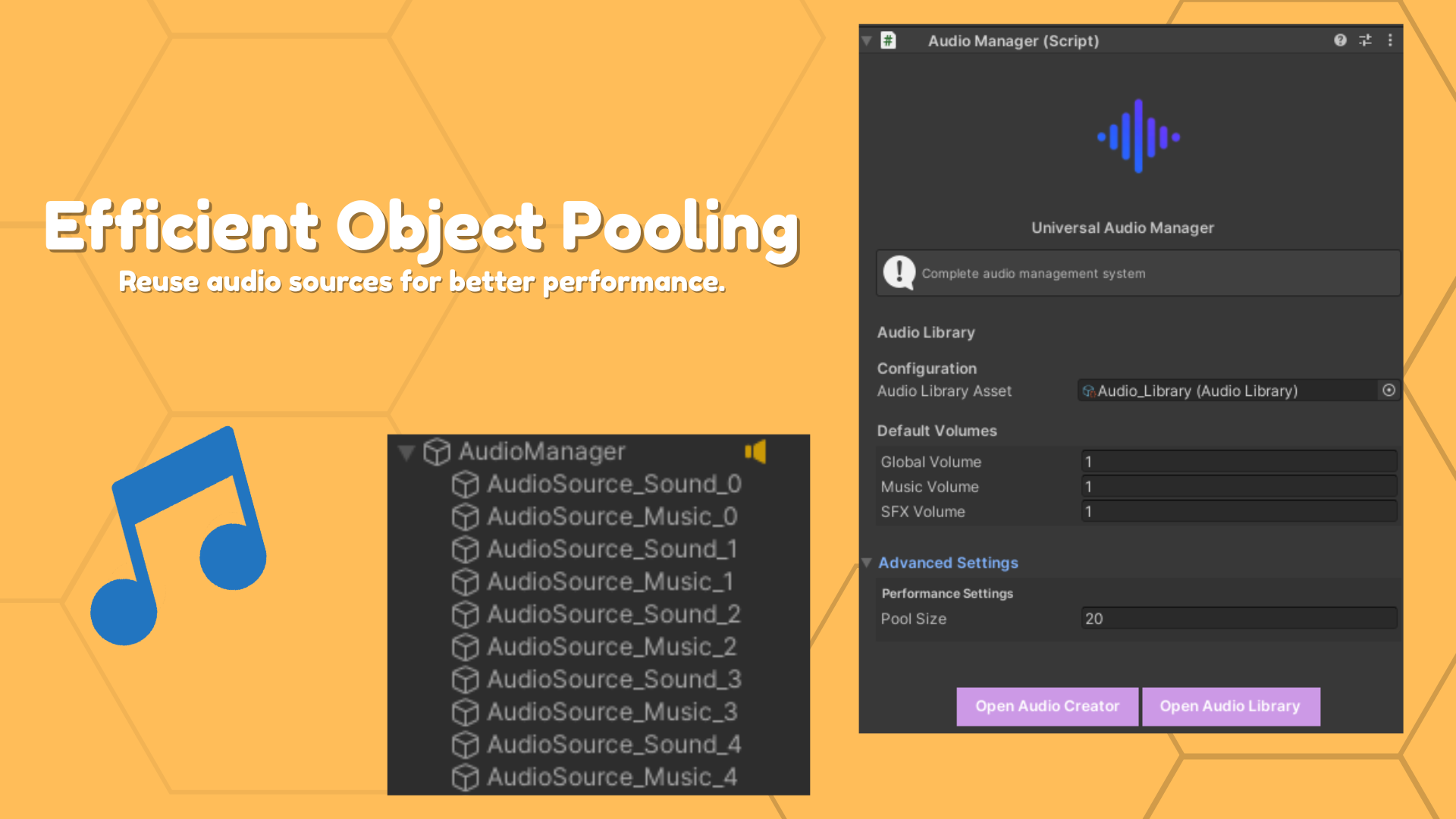 Benefit from object pooling, ensuring performance without creating new AudioSources every time.